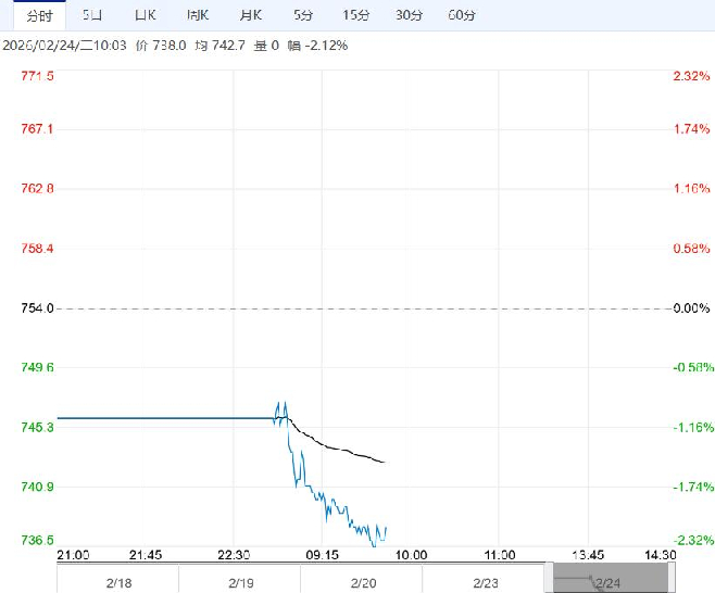 2月24日早盘,铁矿石主力合约承压向下调整,目前盘内报738元,跌幅-2.12%。铁矿石需求存在边际改善的预期,但是由于供应过剩的压力相对更大,盘面价格依然承压,未来继续关注节后终端需求的恢复情况和商品市场整体情绪的变化。