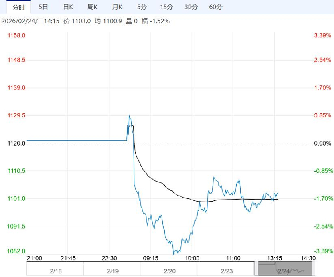 2月24日午盘,焦煤主力合约维持低位震荡,目前盘内报1103元,跌幅-1.52%。从估值的角度看,焦煤当前估值并不高,资金和情绪会加大价格的波动,从风险收益比角度考虑,建议逢低做多,但对于上涨高度不宜过于乐观。