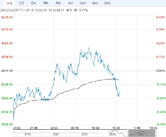 2月25日早盘,白糖主力合约小幅走低,目前盘内报5243元,跌幅-0.17%。当前白糖估值已处偏低水平,下方存在成本支撑,但供需基本面整体偏弱,短期缺乏强势单边驱动,建议观望为主;后续需关注新季种植进展及全球厄尔尼诺效应的影响。