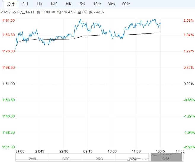 2月25日午盘,纯碱主力合约大幅上行,目前盘内报1189元,涨幅2.41%。随着下游需求逐步恢复,上游库存压力预计有所缓解,纯碱依旧处于低估值弱驱动,短期低位震荡为主,观望或轻仓尝试反套。在供大于求格局未有明显改善下,中期趋势仍以反弹试空思路对待。