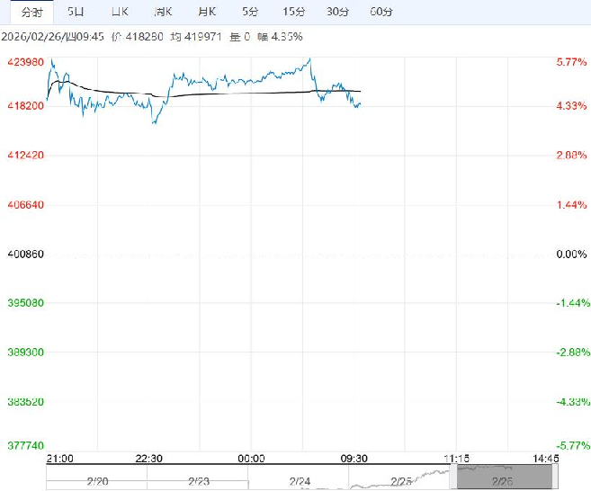 2月26日早盘,沪锡主力合约大幅走高,目前盘内报418280元,涨幅4.35%。基本面上,供给端延续偏紧,而需求端暂未复工。当前价格处于历史高位,下方受供给端,宏观与ai叙事支撑,上方受未来需求端高价负反馈压制。展望未来,预计维持高位震荡,关注印尼审批进度与缅甸实际复产进度。