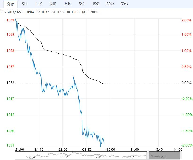 3月2日早盘,玻璃主力合约承压偏弱整理为主,目前盘内报1032元,跌幅-1.90%。节后供应端冷修与点火预期并存,关注后续产线实际变动情况。当前产业信心受盘面波动影响显著,节后需求端尚需恢复过程,关注后续承接力度。中游期现库存较高,未来有待消化。