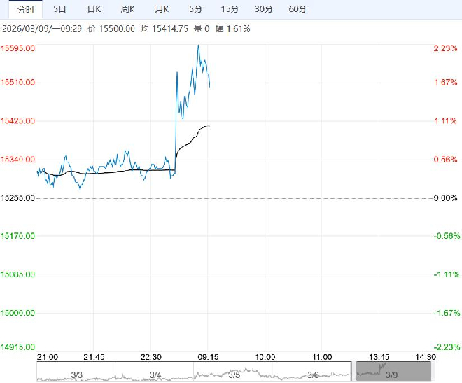 3月9日早盘,棉花主力合约走势表现偏强,目前盘内报15500元,涨幅1.61%。国内,金三银四旺季即将到来,种植面积亦有较大幅度缩减,基本面偏多。但前期涨幅较大,下游接受不易,宏观方面风险也大。棉花进入盘整观望阶段,等待新订单等数据指引。