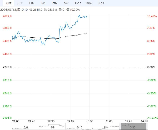 3月12日早盘,烧碱主力合约维持高位震荡,目前盘内报2615元,涨幅10.20%。国内烧碱供需偏弱形势依然严峻,短期市场上涨主要因为地缘冲突带来的乐观预期,需警惕局势缓和后情绪退潮导致的盘面回落,关注下游实际送货量及液氯价格波动。