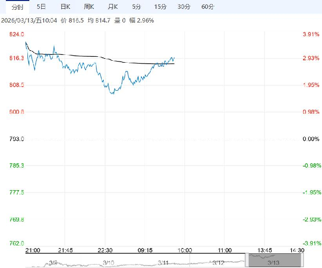 3月13日早盘,铁矿石主力合约维持高位震荡,目前盘内报816.5元,涨幅2.96%。当前库存总量处于近五年同期最高水平。综合来看,需求端虽有利多但效果或许有限。从技术面来看,铁矿石期货短期内有望反弹。策略上,投资者可关注低位做多机会,注意仓位管理。