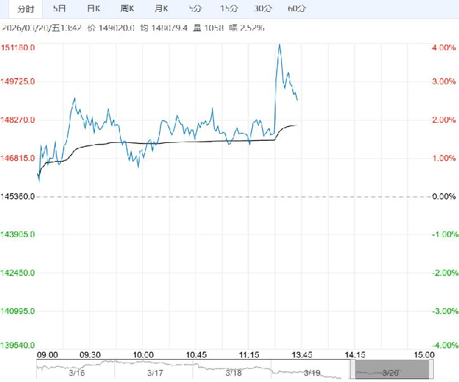 3月20日午盘,碳酸锂主力合约大幅上行,目前盘内报149020元,涨幅2.52%。基本面供弱需强,库存水平偏低,抢出口预期对价格有一定支撑。供应端正逐步复产,库存持续去库,持货商挺价情绪仍在,下游材料厂逢低买入为主。中东地缘冲突尚未结束,资金流向能化板块,主力合约受资金情绪波动影响可能性较大。