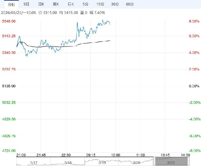 3月23日早盘,乙二醇主力合约维持高位震荡,目前盘内报5515,涨幅7.40%。下游聚酯复工提速,需求逐步回暖,4月港口库存进入去库通道,供需格局由松转紧。油制、煤制乙二醇成本支撑强劲,短期地缘风险未消,资金情绪偏多,价格易涨难跌;中期关注冲突缓和、装置重启与进口到港恢复,高位波动加剧。