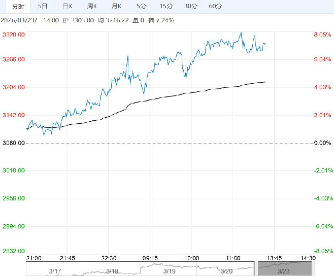 3月23日午盘,甲醇主力合约大幅上行,目前盘内报3303元,涨幅7.24%。上周国内甲醇制烯烃装置产能利用率环比提升,延长榆林中煤二期装置重启,天津渤化负荷提升,随着重启装置以及提负荷装置正常运行,MTO行业开工率预期仍有小幅提升。美伊地缘冲突仍存不确定性风险,甲醇短线价格波动预计仍剧烈,建议暂以观望为主。