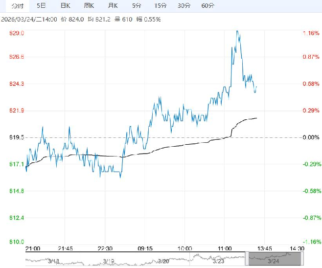 3月24日午盘,铁矿石主力合约震荡走高,目前盘内报824元,涨幅0.55%。当前库存总量处于近五年同期最高水平。综合来看,需求端虽有利多但效果或许有限。从技术面来看,铁矿石期货短期内可能出现反弹。策略上,投资者可关注低位做多机会,注意仓位管理。