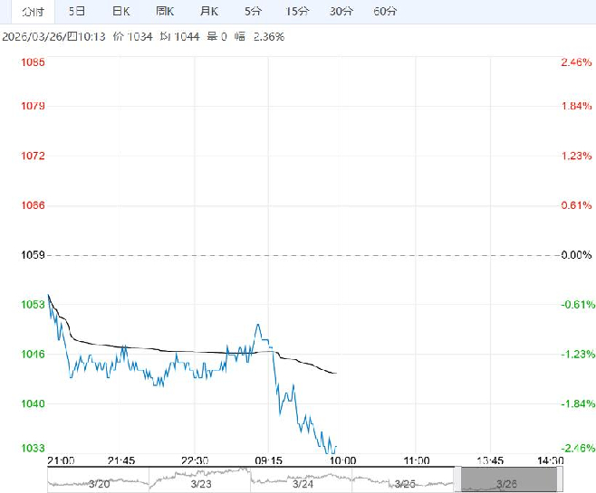 3月26日早盘,玻璃主力合约大幅下调,目前盘内报1034元,跌幅-2.36%。供应端冷修与点火预期并存,关注后续产线实际变动情况。当前产业信心受盘面波动影响显著,需求端尚需恢复过程,关注后续承接力度。中游期现库存较高,未来有待消化。