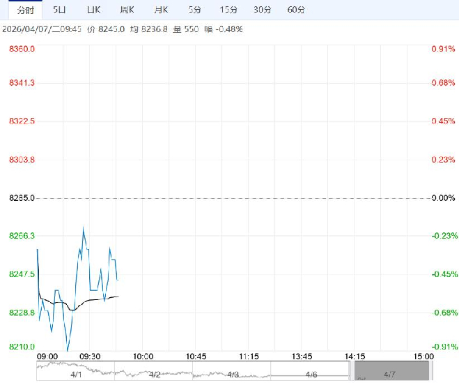 4月7日早盘,工业硅主力合约弱势下行,目前盘内报8245元,跌幅-0.48%。工业硅期货继续向下调整,4月1日市场有两家多晶硅企业计划4月减产的声音,整体供需影响有限,但也有新增的弱利空,下游低价持货意愿一般,盘面继续计价新增弱利空。