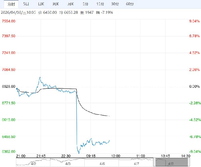 4月8日早盘,PTA主力合约大幅下行,目前盘内报6430元,跌幅-7.19%。PTA大厂公布4月检修计划,涉及产能规模较大,市场供应预期收缩,社会库存有望去化,关注检修落地情况。中东局势突现缓和,原油价格快速回撤,成本端情绪降温,但和谈仍存不确定性。PTA日内或跟随成本回调。建议回调后低多思路,注意控制仓位。