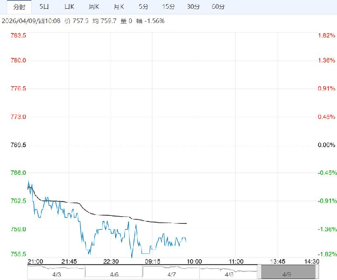 4月9日早盘,铁矿石主力合约维持低位震荡,目前盘内报757.5元,跌幅-1.56%。铁矿石库存小幅回落,不过总体维持高位,压力较大。在库存压力下,铁矿石供应环比小幅回落。铁矿石供需情况仍维持弱势,短期跟随宏观情绪波动。