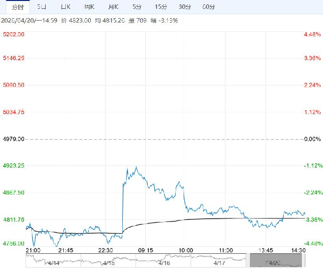 4月20日午盘,乙二醇主力合约大幅下行,目前盘内报4823元,跌幅-3.13%。乙二醇供应收紧,将转入去库阶段对价格有支撑,短期行情预计高位宽幅震荡,关注美伊谈判和霍尔木兹海峡通航进展。中长期,中东局势预计缓和,成本下行及进口逐步恢复,将导致乙二醇价格重心震荡下移。关注中东局势演变。