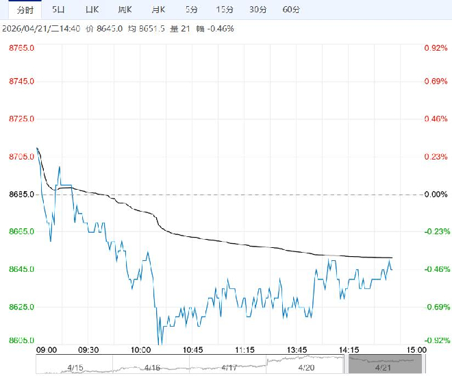 4月21日午盘,工业硅主力合约弱势下行,目前盘内报8645元,跌幅-0.46%。新疆大厂逐步复产,枯水期西南地区复产意愿偏弱。需求端偏弱,库存去库难度较大。考虑到新疆复产需求偏弱高库存,价格承压运行。短期主力合约震荡运行为主,可考虑区间策略。