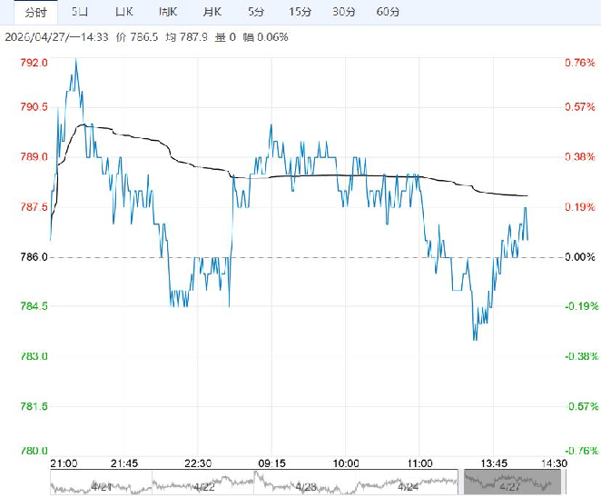 4月27日午盘,铁矿石主力合约小幅上涨,目前盘内报786.5元,涨幅0.06%。宏观面,二季度国内反内卷供调整方案仍有落地预期,强化黑色系供给收缩的逻辑。供需双增,港口去库对价格形成支撑,但高库存绝对水平仍构成压制。